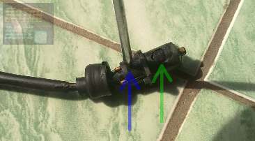 Bukan diputar obengnya tapi dorong keatas sambil body saklar tadi ditarik keluar, jangan ditarik kabelnya tar putus dong.. Kalau bisa cabut juga socket di ujung kabel biar enak benerinnya. Kita lihat disitu ada tonjolan (panah biru) yang fungsinya sebagai sebagai pengait body saklar, ada juga pengait yang tadi kita dorong keatas pakai obeng (panah hijau) :