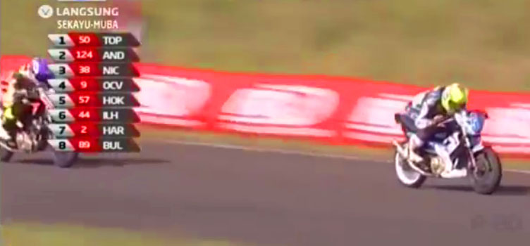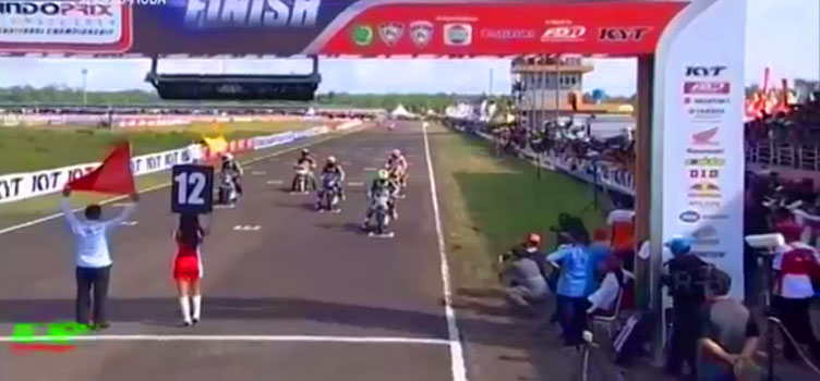 Namun setelah semua pembalap menempati posisinya masing-masing di awal lap pertama sepertinya asap dari Jupiter MX hilang dan bisa tetap mengikuti lomba, selengkapnya Indoprix 150cc ini diikuti :