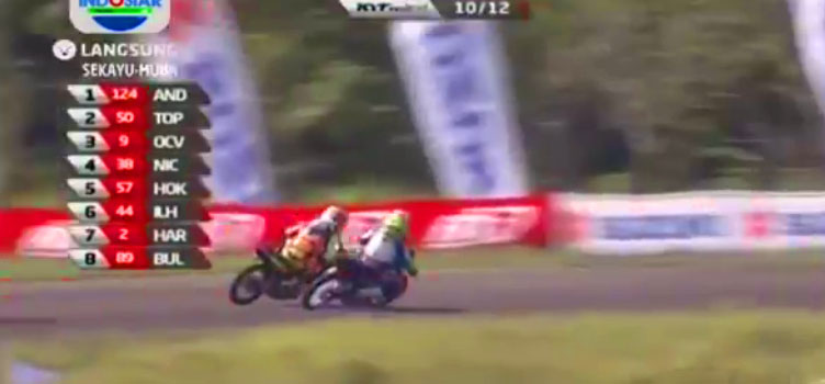 Di lap 10 Hokky yang tadinya diposisi ketiga merosot keposisi 5, sedangkan Ocvan berhasil menempati posisi ketiga. Posisi 1 & 2 masih tidak berubah ditempati oleh Topan & Andi, hampir saja Andi menyenggol motor Topan ketika Topan menyalip dari sebelah kanan. Setelahnya menjelang masuk ke lap 11 Topan sempat dadah-dadah dulu kepada penonton.. Busyeeett!