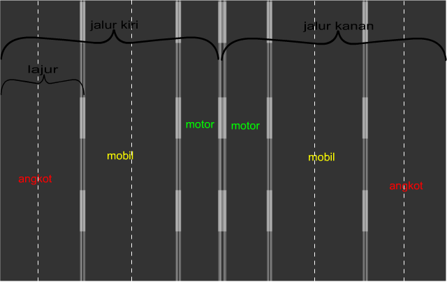 - Jika masih macet, pisahkan masing jalur jalan dengan 3 lajur yang biasanya terjadi kemacetan seperti gambar dibawah :