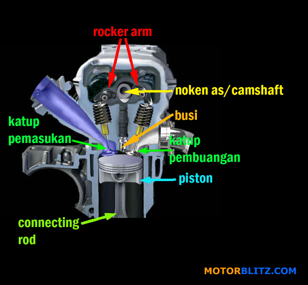1. Katup pemasukan, Katup ini fungsinya untuk mengatur timing atau waktu kapan campuran udara dan bahan bakar masuk.