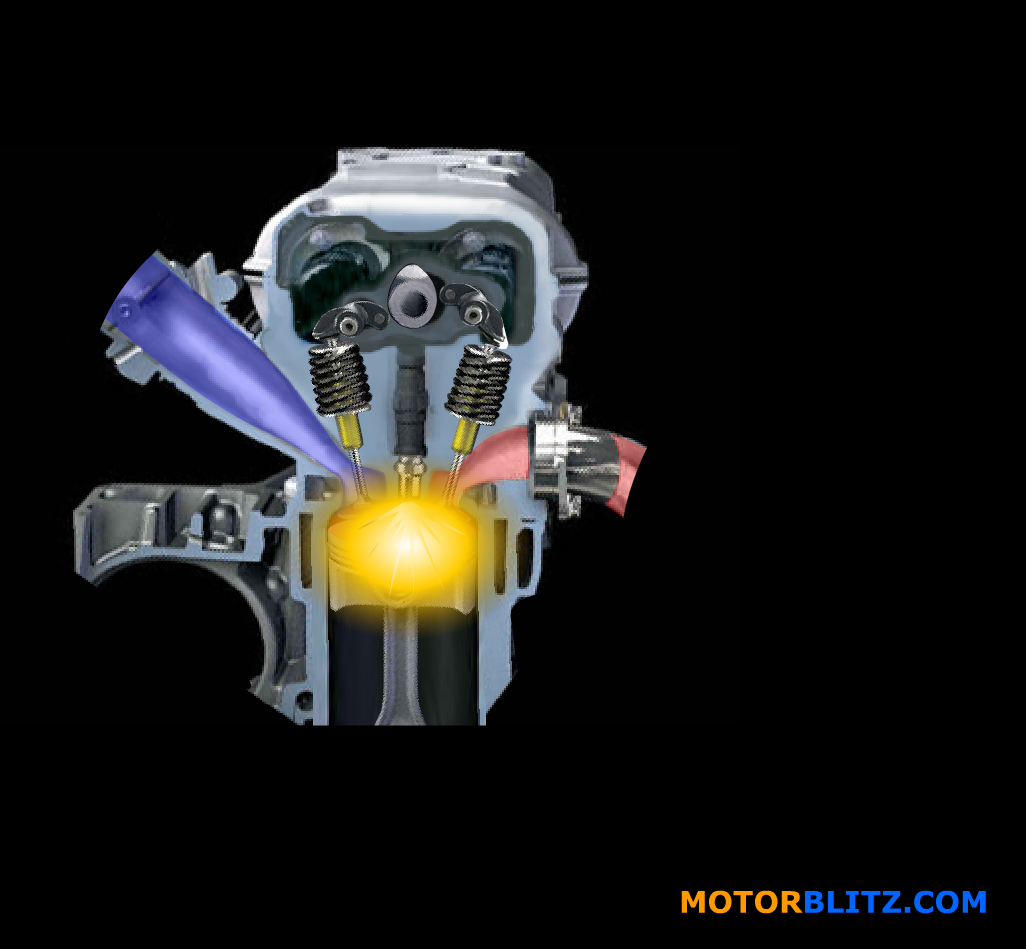 3. Pada waktu piston diatas campuran udara dan bahan bakar yang dipadatkan tadi akan terbakar karena busi memercikan api sehingga campuran udara dan bahan bakar akan meledak dan menekan piston kembali kebawah, proses inilah yang disebut langkah usaha atau power.