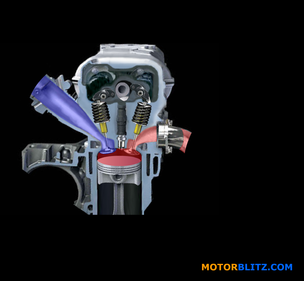 1. Langkah pertama yaitu langkah penghisapan bahan bakar atau yang disebut “intake”, jadi pada saat piston di atas katup pemasukan akan terbuka sehingga pada saat piston bergerak dari atas ke bawah akan menghisap campuran udara dan bahan bakar seperti gambar ini :