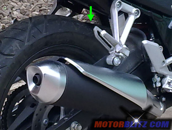 Ternyata Photo gallery New Honda CBR150R yang sempat MB tampilkan kemarin – kemarin sebenarnya ada part yang sudah dimodifikasi, part atau bagian yang sudah dimodikasi itu adalah kedua roda Honda CBR150R ini sudah diganti dengan ban yang lebih besar. Ban belakang standar Honda CBR150R merk IRC Road Winner yang ukurannya 130/70-17 diganti dengan merk yang sama dengan ukuran 140/70-17, sedangkan ban depan standar Honda CBR150R merk IRC Road Winner yang ukurannya 100/70-17 diganti juga dengan merk yang sama dengan ukuran 110/70-17. Walaupun penggantian ban ini masih dalam batas toleransi yang dianjurkan namun ternyata bagian atas spakboard kolong Honda CBR150R ini menyentuh ban belakang.