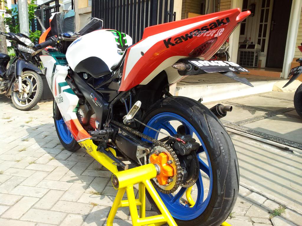 Bagi pecinta motor kencang khususnya motor bermesin dua tak pasti kenal dengan nama Kawasaki Ninja 150 RR. Salah satu keistimewaan Kawasaki Ninja 150 RR ini ada di mesinnya yang mampu mengeluarkan power sebesar 30 PS dan yang sulit dilupakan adakah efek nge-KIPS-nya yang mampu menciptakan jambakan setan. Dengan kata lain bagi pemilik Kawasaki Ninja 150 RR soal mesin tidak perlu banyak modifikasi dan untuk tampangnya pun tinggal poles dikit di bagian body sang Super KIPS ini pasti tampil beda.Nah..kira – kira gimana ya tampang Kawasaki Ninja 150 RR ini setelah bodinya modifikasi?