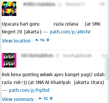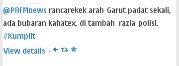 Untuk menghindari razia pastinya kita harus mengetahui tempat – tempat yang biasanya sering ada razia, caranya bisa tanya ke teman, sahabat, pacar, selingkuhan, saudara, tentang lokasi razia kendaraan bermotor ini. Selain itu kita juga bisa mengetahui tempat – tempat yang biasanya sering ada razia dengan mencari informasi di medsos seperti twitter. Caranya ketik “razia + kota tempat tinggal Bro & Sis” misalnya “razia bandung”, “razia makasar” dll, nanti pastinya Bro & Sis menemukan tweet – tweet mereka yang pernah atau lewat razia seperti ini :