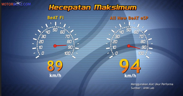 Top speed Honda BeAT eSP pun bertambah mencapai 94 Kmph sedangkan Beat Fi hanya 89 Kmph.