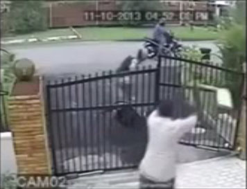 Si maling mulai panik ditendangnya pintu pagar namun untungnya si motor masih nempel :