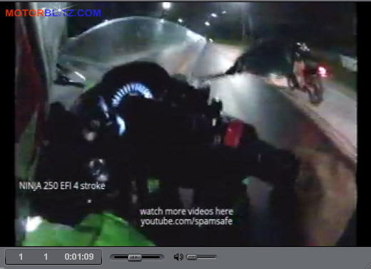 Di menit 1.15 Ninja 250 FI berhasil menyalip Ninja 150 R, tampilan gambar diambil dari camera Ninja 150 R :