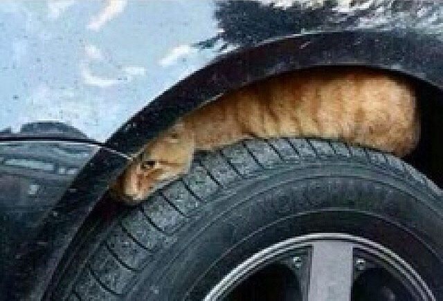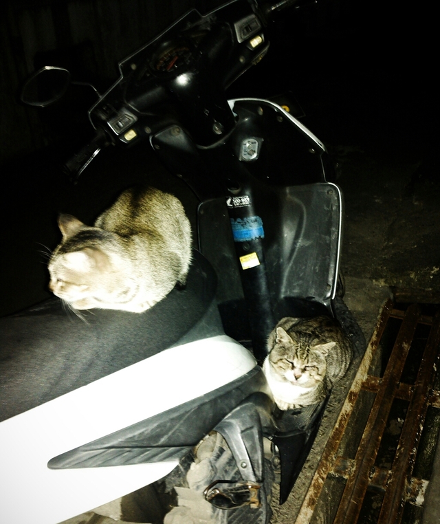 Ngomong – ngomong tentang binatang.. Binatang yang paling sering terlihat disekitar kita siapa lagi kalau bukan kucing. Yup.. kucing – kucing ini kalau kedinginan biasanya suka menghangatkan tubuhnya di kendaraan termasuk sepeda motor. Mereka biasanya tidur – tiduran di bawah deck (motor matic) atau di sekitar jok (motor apapun), bahkan yang paling ekstrim ada juga kucing yang tidur di bagian mesin motor seperti ini :
