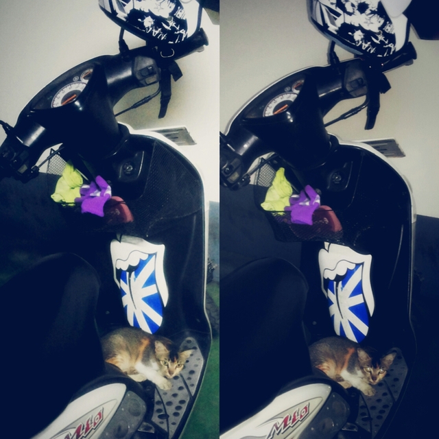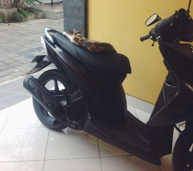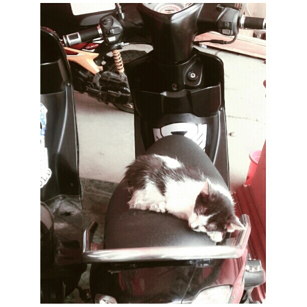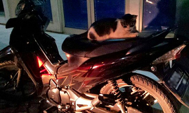 Nah kalau cuaca tidak terlalu ekstrem atau agak cerah, kucing juga suka berjemur, tiduran, atau sekedar nongkrong – nongkrong naik di atas motor dan anehnya, biasanya kucing kalau naik motor posisinya terbalik. Jadi kalau ada tebak – tebakan apa bedanya orang naik motor sama kucing naik motor, jawabannya kalau orang menghadap ke depan kalau kucing kebelakang. Gak percaya? ini dia contohnya :