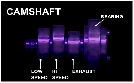 Seperti yang terlihat di gambar atas selain Low Rocker Arm dan Hi Rocker Arm ada beberapa komponen sebagai penunjang sistem VVA di Yamaha NMAX yaitu Exhaust Rocker Arm, Katup pemasukan Bahan Bakar (In Valve), Katup pembuangan (Exhaust Valve), dan Camshaft. Camshaft inilah yang mengatur naik turunnya Low Rocker Arm dan Hi Rocker Arm dan juga Exhaust Rocker Arm dan ini dia penampakan Camshaft dari atas :