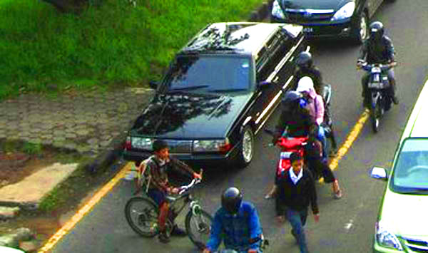 Photo yang sepertinya diambil di jalan Sukarno-Hatta Bandung, tepatnya di kawasan Metro Margahayu ini terlihat seorang anak kecil mengendarai sepeda di belakang pelajar SMU, mereka sama-sama sedang menyebrang  jalan namun sebenarnya bukan hanya mereka, di kawasan ini banyak juga pedagang dengan gerobaknya menyebrangi jalan, terlihat satu blok pembatas jalan pun hilang. Memang di sebelah kanan sekitar pertigaan banyak pedagang kaki lima terutama pedagang makanan.