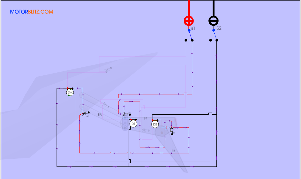 2. Seperti biasa setelah BT ini mentok akan menekan ST2 aliran arus listrik menjadi Terminal positif sumber listrik —> S1—> ST2 —> SB1 —> DB —> S2 —> Terminal negatif sumber listrik, karena DB dialiri arus listrik akan membuat DB berputar dan membuat BB terbuka.