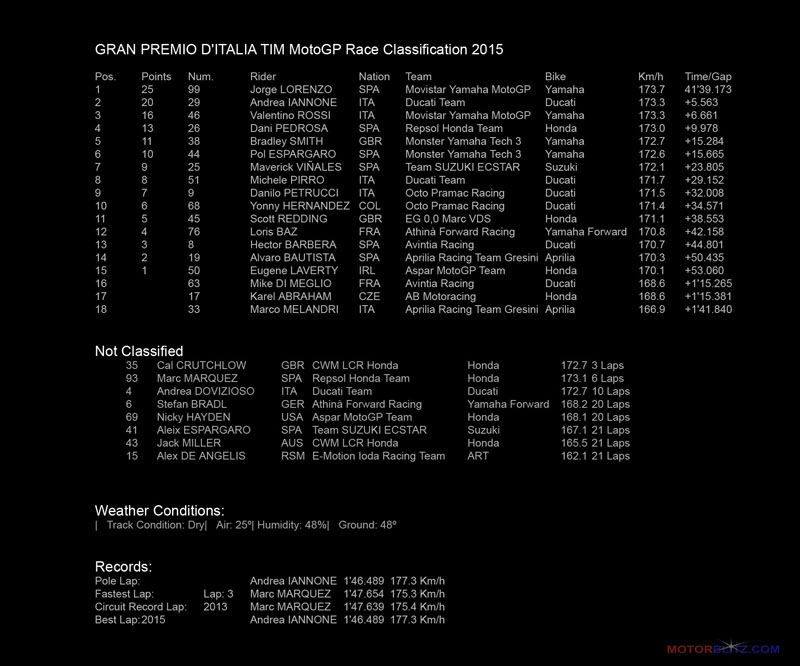 MUGELLO GRAN PREMIO D’ITALIA TIM MotoGP Race Classification 2015