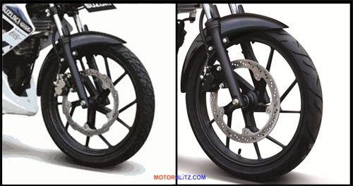 Selain itu 3 jenis/varian New Suzuki Satria FU150 ini juga dilengkapi dengan fitur pengaman kunci atau yang disebut fitur “Safety Shutter Key”. Namun di sisi roda ada juga perbedaannya, untuk ban New Satria FU150 SE dan New Satria FU150 R menggunakan ban tubeless dan desain cakram bergerigi (Petal Disc Brake) untuk piringan cakram rem depan dan belakang, sedangkan untuk New Satria FU150 S menggunakan ban dan cakram tipe biasa. Untuk perbedaannya bisa dilihat di gambar di bawah ini yang kanan New Satria FU150 S dan kiri New Satria FU150 SE dan R :