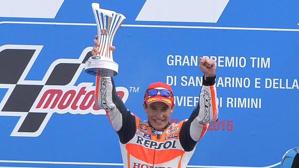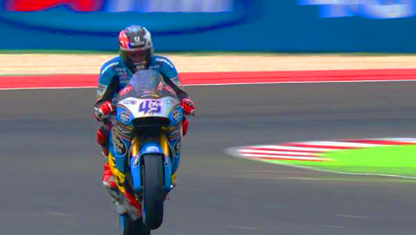 Race MotoGP di sirkuit Marco Simoncelli, San Marino, Italy diwarnai dengan beberapa kejadian yang tidak bisa diprediksi sebelumnya. Sebelum garis finish di sirkuit ini para pembalap harus melewati 28 lap, namun masalahnya di pertengahan lap turun hujan gerimis yang memaksa para pembalap menganti motornya dengan ban yang sesuai.