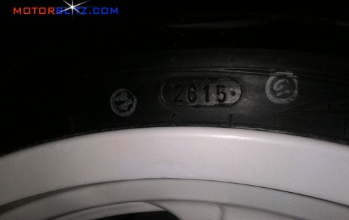 Artinya 2 angka dari depan adalah banyaknya minggu dan dua angka selanjutnya menunjukkan tahun pembuatan. Seperti yang terlihat di gambar atas di ban tersebut tertera angka 3015, artinya ban tersebut dibuat pada minggu ke 30 di tahun 2015. Satu bulan 4 minggu jadi 30 dibagi 4 hasilnya 7.5, dengan kata lain ban tersebut selesai dibuat pada pertengahan bulan Agustus 2015. Nah coba tebak kapan ban di gambar di bawah ini selesai dibuat? :