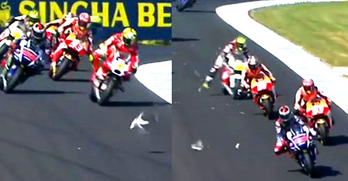 Published Oktober 19, 2015 at 500 × 261 in Detail foto Iannone tabrak Seagull atau burung camar di Sirkuit Phillip Island MotoGP 2015.