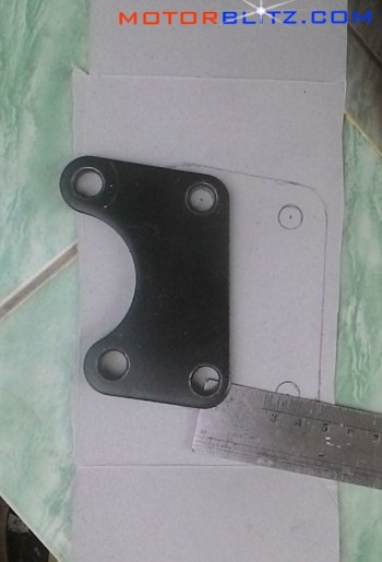 Untuk membuatnya langkah pertama sesuaikan letak braket sampai bagian pinggir cakram mentok di kedua bagian atas dan bawah braket rem, selanjutnya kita ukur dan catat jarak untuk bagian tengah lubang baut atas dan bawahnya :