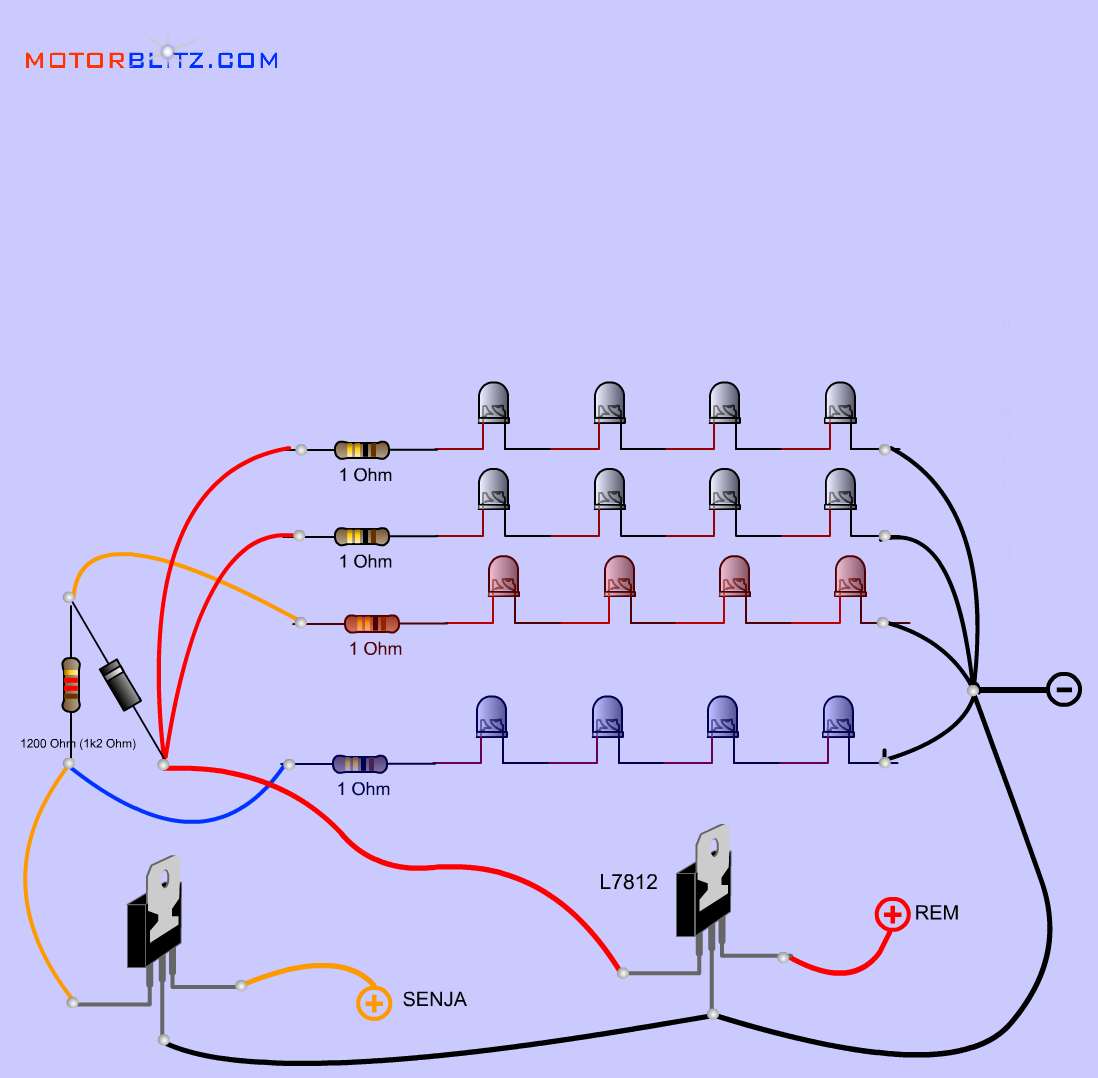 Rangkaian sederhana penstabil tegangan arus listrik untuk lampu LED motor.