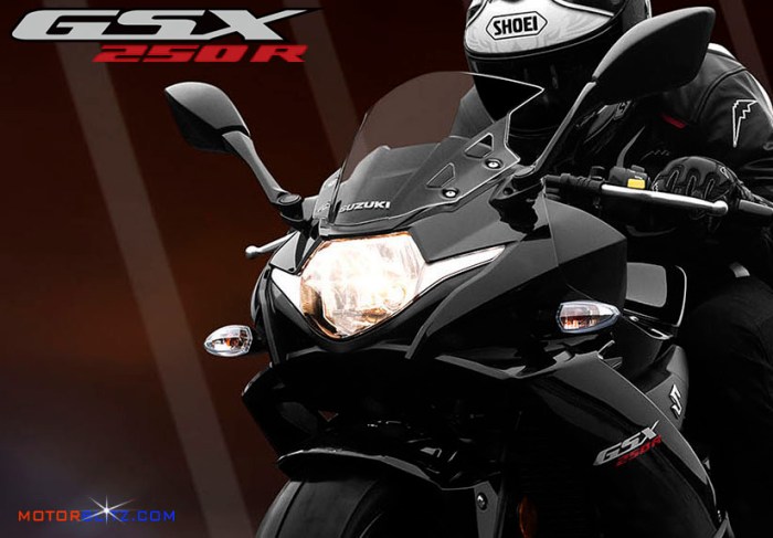 Motorblitz.com. Seperti yang telah dikabarkan sebelumnya setelah perkenalan perdananya di pameran otomotif Intermot di kota Cologne – Jerman, selanjutnya Suzuki pun akhirnya memperkenalkan New GSX250R di pameran otomotif EICMA di Milan-Italy. Tak lama waktu berselang Suzuki juga memperkenalkan fitur dan spesifikasi GSX250R di situs resminya di globalsuzuki.com. Dilihat dari posisi rider GSX250R ini diciptakan sebagai motor sport touring yang bergaya racy namun tetap nyaman digunakan untuk kegiatan sehari-hari maupun perjalanan jauh ke luar kota, karenanya power GSX250R pun diciptakan agar lebih responsive berakselerasi dari kecepatan 20Kmph – 90Kmph.