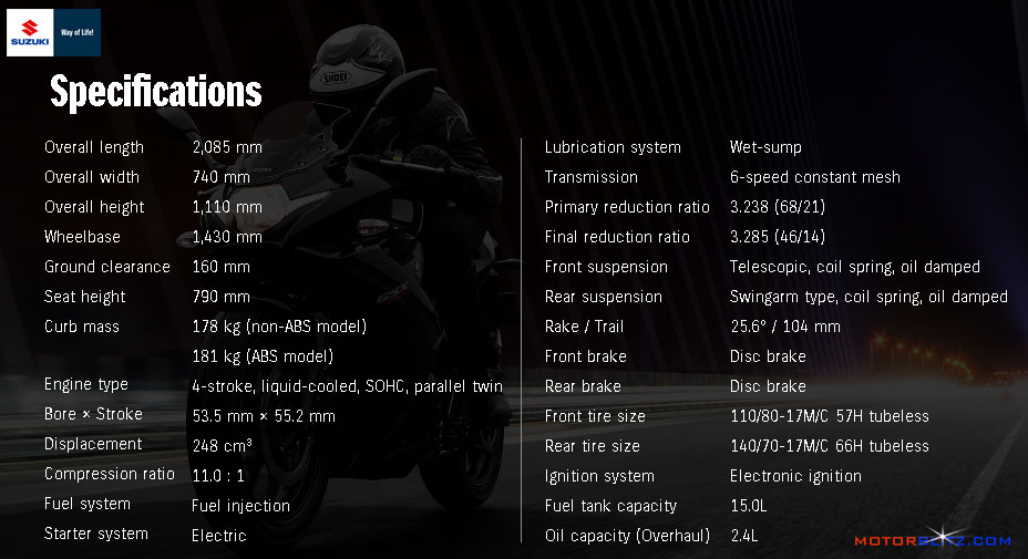 • Spesifikasi New GSX250R 2017 Versi Global. Desember 31, 2017